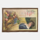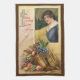 Ett vintageillustrerat Thanksgiving-kort med en kvinna och ett ymnighetshorn med frukter och texten "All tack till Thanksgiving är din".