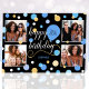 Skapa ett hälsning-kort för fotokollage i snyggt! Anpassa mallen med fyra favoritfoton, mottagarens namn och födelsedagsålder. En roligt med runda konfektyrer, ballonger och "Grattis på födelsedagen" i ett trendig-skript. Perfekt för familj, barn, vänner och husdjur! Tryckt färg: blått, svart, vitt och guld.