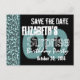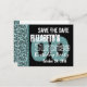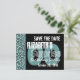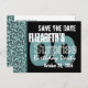 Här är en trendig "spara datum"-design för en ÖVERRASKNINGSFEST, ett turkost eller akvatiskt geometriskt mönster med svarta accenter. Modern och elegant!