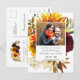 Dramatisk och elegant Spara datumkortet innehåller ditt pars fotografi omgiven av stora blommor och höstblad. Den arrangemanga blommigten innehåller solblommor av gyllene gult, mörk röd ros och vita vattenblommor. Djupa gröntar och löv av oliver fördjupar höstvisken. Modern Boho Botanical är mycket populär denna säsong. Grått-texten i mjuk duva ger information om bröllop. Det här Spara datumkortet ingår i samlingen Solros och Burgundy. Den har de mallar du behöver för att skapa en Spara datumpapperskorgen som dina gäster inte glömmer!