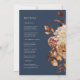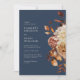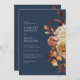 Hela flottan kommer in på en bröllopsinbjudan. Den här inbjudan från elegant bröllop innehåller handmålad vattenfärg, bränd orange och terracotta löv, kräm och beige dahlias och vacker rost-färgad ro på marin blå bakgrund. Baksidan av innehåller text som du kan använda för att lägga till information om bröllop. Sök efter matchande objekt i Bröllop-samlingen för marinblå höst Romantik.