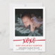 Elegant, snyggt Valentindags födelseattest med ett enda foto av baby, xoxoskript i djupt rött färg på vit bakgrund, möta vårt lilla valentinskript, namn och födelsestatus.