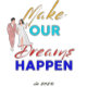 Bilden visar ett vitt keramiskt mugg med ett inspirerande budskap tryckt på den. Texten på mugg lyder: "Gör våra drömmar till verklighet 2025." Orden "Gör" och "Dreams" skrivs i ett kursivt teckensnitt med "OUR" och "HAPPEN" i fet, versaler brev. Uttrycket "under 2025" är skrivet i ett mindre, kursivt teckensnitt vid grund. Det finns också en illustration av ett par som är formellt klädda och placerade på den lämnat texten. Mugg är intressant och relevant eftersom det fungerar som en motiverande punkt och uppmuntrar användaren att fokusera på att uppnå sina drömmar och mål senast 2025.