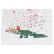 En söt illustration av en grönt alligator eller krokodil som bär en party-hatt och blåser party horn med konfetti som regnar ner på den. Låt firande börja! Perfekt för alla som kärlek roliga djurillustrationer, krokodiler, krokodiler eller reptiler. Perfekt för en födelsedagspresent, daghemsdekoration, barnrumskonst, hemdekaler, Julklapp eller gåva till något annat specialtillfälle.