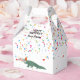 En söt illustration av en grönt alligator eller krokodil som bär en party-hatt och blåser party horn med konfetti som regnar ner på den. Låt firande börja! Perfekt för alla som kärlek roliga djurillustrationer, krokodiler, krokodiler eller reptiler. Perfekt för en födelsedagspresent, daghemsdekoration, barnrumskonst, hemdekaler, Julklapp eller gåva till något annat specialtillfälle.
