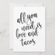 En elegant som klipper ut kant bröllop-tecknet, innehåller texten "Allt du behöver är kärlek och takos" i ett extraherat skriptteckensnitt, penseln struktur tillför en spontan och lekfull känsla. Bakgrunden till färg kan ha personlig enligt dina behov och önskemål. Kontakta mig om du har någon speciell begäran.