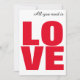 Det här är ett hälsningskort för stil på vykort. Ord KÄRLEK ligger i stort, djärvt rött brev. Längst upp i, i ett svart skriptteckensnitt, finns orden "Allt du behöver är". På baksidan av detta kort finns ett utrymme för returadressen. Det finns också styrt linjer för det utsändande adress. Om du inte vill använda detta som vykort kan du ta bort det styrda linjer och använda det här kortet med ett kuvert.