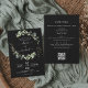 Budgeten Alla i en svart QR-kod Eucalyptus Grey Succulent Botanical Watercolor Vår bröllop-inbjudan på vit bakgrund - innehåller vacker och elegant manustypografi med modernt botaniskt löv och grön för den speciella Bröllopsdagen firande.