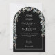 En elegant vildblomma akvarell blomsterbåge bröllopsinbjudan med chic vit typografi på en stilfull svart bakgrund. Med all din speciella bröllopsdagsinformation på baksidan, inklusive din RSVP, boende och ytterligare detaljer. Designad av Thisisnotme©