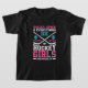 Hockey Tema T-shirt för hockeyflickan med hockeypucks, pinnar och hjälmar med rosa, vit och blå text som lyder Sugar, Spice och All Ice Det är vad Hockey Girls är gjord av!