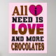 Allt jag behöver är Kärlek och fler choklad, den här designen har en djärv rosa och brun text som säger: "Allt jag behöver är KÄRLEK och fler choklad". För all choklad älskare.