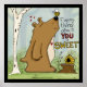 En söt björn står nära en bikupa som är sitta på en stump medan ett bi sitter på toppen av björnens näsa. Trärlandsmemat med en pun kommer att upplysa ditt hjärta.Den ursprungliga designen av Christie Black från Creations från hjärtat.