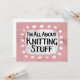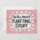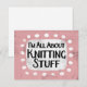 "I'm All Om Knitting Saker" är en söt textdesign på rosa med svart och röd text, tillsammans med en vit accentform och vita texturerade vita punkter runt den.