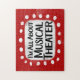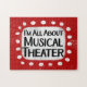 "Jag är All Om Musical Theater" är en söt textdesign i rött med svart text, tillsammans med en vit accent-form och vita texturerade vita prickar runt den.