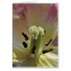 Innertext (kan ändras eller tas bort): "Bönreceptiv... Du vet aldrig vem som kan flyga förbi." Omgiven av pollenhaltig stämpel är stigman (pollenreceptorer) på en papegoja tulp redot att få pollen från nästa besökande insekt.