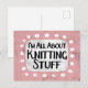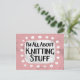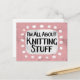 "Jag är helt inställd på stickning" är en söt textdesign i rosa med svart och röd text, tillsammans med en vit accentform och vita texturerade fantasifulla prickar runt omkring.