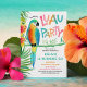 Det tropiska temat födelsedagsinbjudan innehåller en färgfull papegoja på en bambu gren som gränsar till vattenfärgen hibiscus blommor och handflatan löv. Det finns en "Aloha"-hälsning överst bredvid "Luau Party"-typografi i skuggor av rosa, orange och turkos. Perfekt för strand-, sommar-, Hawaii-, Tiki party- och öteman. Fungerar underbart för alla åldrar eller gender. Bild av KL Lagrar.