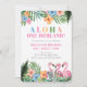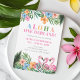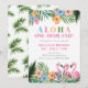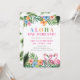 Aloha Onederland Sommar Tropical Girl 1-års födelsedagsinbjudan har en livfull tropisk design med frodiga gröna blad, rosa flamingos och färgglada blommor på vit bakgrund. Den lekfulla titeln "ALOHA ONE-DERLAND!" sätter den roliga tonen, med utrymme för personligt namn och festdetaljer.