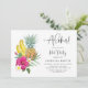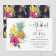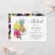 Aloha! En färgrik tropisk poolparty-inbjudan med akvarellillustrationer av ananas, bananer, plumerior och varmröda hibiskus. Anpassa genom att lägga till dina evenemangsuppgifter. Denna blomstertropiska inbjudan är perfekt för sommarens poolpartyn.