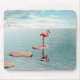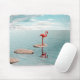 A minimalist surreal artwork featuring a solitary flamingo standing on stepping stones above calm water, surrounded by open space and soft light. The composition evokes themes of solitude, balance, patience, and inner calm. With its clean lines and tranquil atmosphere, this piece is ideal for modern interiors, contemporary wall art, and collectors drawn to quiet, contemplative visuals.