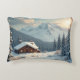 Den alpininspirerade vinterscenen med en mysigt kal omgiven av snö-täckt träd och stora berg. Perfekt för rysk dekoration, säsong konst och helgdag inspiration!