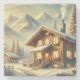 Den alpininspirerade vinterscenen med en mysigt kal omgiven av snö-täckt träd och stora berg. Perfekt för rysk dekoration, säsong konst och helgdag inspiration!