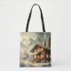 Den alpininspirerade vinterscenen med en mysigt kal omgiven av snö-täckt träd och stora berg. Perfekt för rysk dekoration, säsong konst och helgdag inspiration!