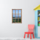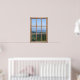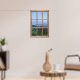 Poster som ser ut som ett fönster - en Alperna-scen Detta är en typisk alpregion från ett berg, tittar vid ett annat byggnad som går högt i Alpernornas berg och vid topparna av ett avlägset bergsområde utanför. Nedan finns ängar och träd på gröntens sluttningar. Bild som ser ut som ett fönster fångar andan från en alpreadag i Europas berg.
