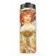 Termisk skakapparat med Alphonse Muchas lithograf Reverie (1897). En kvinnas porträtt i en vit klänning läser en bok, sitta framför rosa och orange blommor. En underbar gåva till fläkt av Art nouveau och bohemisk konst.
