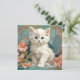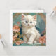 Kort med en vit katt i Alphonse Muchas stil! Denna blåögda luddiga kattunge poserar med rosa blommor och blåa filtar. En fantastisk present till kattälskare och Art Nouveau-samlare!