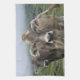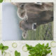 Ett foto av två alpina kor för braunvieh med fluffigt öron på en dimmig bergbakgrund.