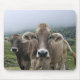 Ett foto av två alpina kor för braunvieh med fluffigt öron på en dimmig bergbakgrund.