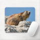 Closeup Alpine marmot sten med blå himmel som bakgrund, i Alpernorna Fransk, i departementet Savoie vid La Plagne