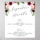 Beundra Rosa & Burgundy Blommig Bröllopsbar signaturdryckes skylt med anpassad textaffisch - med orden "signaturdrycker hans och hennes" skrivna i ett vackert, svängt kalligrafiskrift. En elegant, chic och ändå enkel design i svart typsnitt och valfri bakgrundsfärg. Klicka bara på länken anpassa ytterligare, som visas under textanpassningsområdet till höger, och välj din anpassade bakgrundsfärg. Denna skylsmall gör det snabbt och enkelt att skapa fantastiska tillägg till din bröllopsdekoration. Kompletterande dekorationer, skyltar och brevpapper finns tillgängliga i min butik och samling nedan. Om du behöver något som inte redan finns tillgängligt, vänligen kontakta mig på Zazzle.