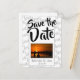 Ett sött Spara Datumet-brevkort med plats för ett personligt foto, parets namn och bröllopsdatum. Kärlek är skriven i ljust grått som ett ordkonstmönster.