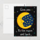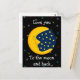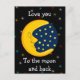 Sovande gul måne på en blå natthimmel prydd med små gula stjärnor. Bakgrunden är svart med färgglada stjärnor prickade runt omkring. Ovanför och under månen står orden "Älskar dig till månen och tillbaka" i vit text.