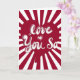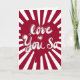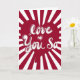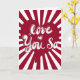 Gör ett djärvt kärleksförklarande med det här livliga gratulationskortet från "Love You So" Sweethearts Collection. Med retroinspirerad bubbelbokstavsstil över ett slående rött hjärta och svart-vit bakgrund i form av en måltavla utstrålar designen kul, självförtroende och passion.
