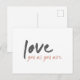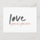 Modern, minimalist ”älskar dig som du är” inspirerande vykort i en stilren off svart med dammig rosapink accent i en handmålad typsnittsstil med skandinavisk minimalism och inspirerad av romantik, uppmuntran, inspiration, motivation, vänskap, vänlighet och resor.