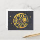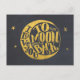 Vykort med en bedårande och romantisk typografisk design med en halvmåne och gyllene stjärnor på en bakgrund med en svart svart tavla-struktur. Texten säger älskar dig till månen och tillbaka, Sött, fantasifullt och roligt.