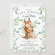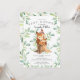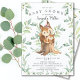 Snygg inbjudan till babykalas med söt babyekorre med mamma som sitter på en stubbe och inramad med naturliga gröna akvarellblad på en vit bakgrund. Vänd på vår inbjudan för att se en matchande grön bladrygg för en extra speciell touch..