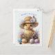 Den knubbiga gula ankungen sitter i en rede med vackert dekorerade påskägg. Hon har sin favorit halmhatt på sig. Vackra blommor och en fjäril sitter på hattens kant. Personlig text, hälsning för påsk.