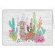 Ett mjukt, vattenfärg med en llama som varar slö bland kaktus. Konstnär: Mary Urban