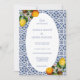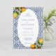 Amalfi Coast Italien Medelhavs citron bröllopsinbjudan, med blå plattor, citron och oval ram. Bellissima Italia © Du kan anpassa med dina namn och text. Du kan ändra textfärg och teckensnittsstil med hjälp av alternativet anpassa ytterligare. OBS: Färger som visas online kan variera något från den faktiska produkten.