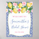 Vattenfärgscitroner med rosa ros och ponnyer mot en bakgrund av koboltblått och vitt mönster för denna snyggt Möhippa eller välkomstskylt för babyskor.