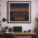 Fånga den vidsträckta horisonten och de lysande stadsbelysningarna i Texas Panhandle med denna Amarillo-centennariesaffisch. Till minne av Route 66:s 100-årsjubileum visar detta vintage-inspirerade konstverk Amarillos skyline som reflekteras över vattnet under en vidsträckt, stjärnfylld natthimmel. Designen blandar den gyllene värmen från den nedgående solen med djupa indigofärger och firar den robusta anden och den historiska betydelsen av denna stora anhalt på Moder Vägen.