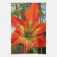 This Kitchen Towel showcases the intense beauty of a flower, an Amaryllis blooming in the garden. The original photograph by ZoeSPEAK is a closeup, and the details of the flower, the shapes and color changes from the center outward are amazing. From soft shades of green blending into yellow, the bloom finishes with five outstretched petals in deep, rich oranges against a background of green leaves and muted brown wood.
