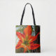This Tote Bag showcases the intense beauty of a flower, an Amaryllis blooming in the garden. The original photograph by ZoeSPEAK is a closeup, and the details of the flower, the shapes and color changes from the center outward are amazing. From soft shades of green blending into yellow, the bloom finishes with five outstretched petals in deep, rich oranges against a background of green leaves and muted brown wood.