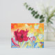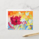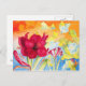 Amaryllis Morgongloriskt vykort. Detta färgkort visar en spray med Red Amaryllis och MorgonGlorier på en orange och blå bakgrund.