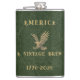 America a Vintage Brew Eagle 1775 - 2026 Flask. This dark green faux leather flask celebrates the USA 250th anniversary with a golden eagle and typography exclaiming America - A Vintage Brew. 1776-2036. A perfect gift for Dad, Grandad or a friend as part of the 4th of July celebrations.