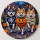 Den berömda amerikanska eskimo Hundar som är klädd i lekfulla Halloween-kostymer bär pumpkiner medan man lurar eller behandlar under det månbelysta himmel. Denna festliga utformning belyser rasens flytande vita jacka, skarp ögon och livlig anda, som perfekt fångar upp den spooky-roligt-atmosfären från Halloween-natten. Ett härligt firande för hundälskare och Halloween fläkt.